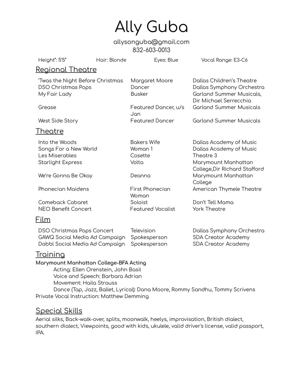 Hi there! I’m Ally Guba, an actor, singer, dancer, and proud dog parent located in NYC. I was born in Japan (no, I sadly don’t have citizenship) but spent the majority of my young life in Dallas, TX. There I spent my time getting onstage anywhere that would let me and enrolled in voice lessons and dance & acting classes throughout the Dallas area.